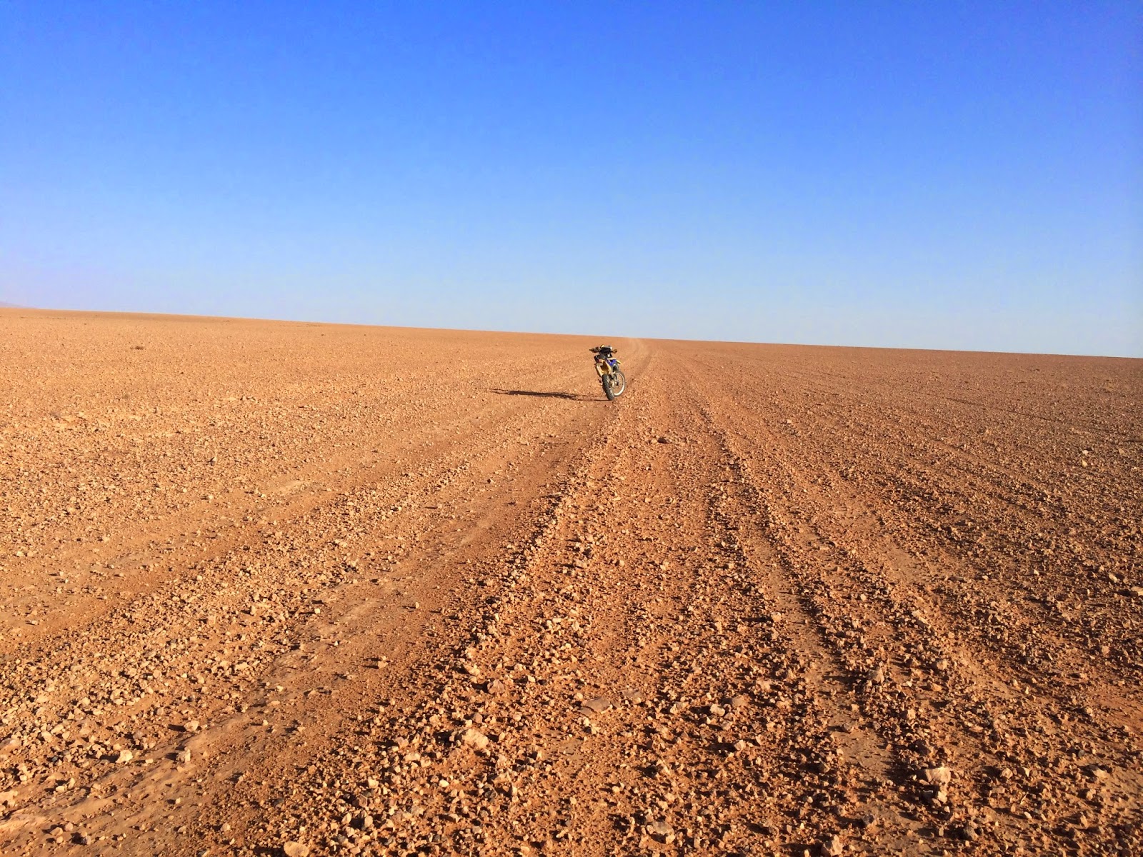 Aceptamos que no perderemos tiempo ni para fotografías, ni para descansos no necesarios. Estamos cansados y algo doloridos, pero 500 kms de pista son muchos y no queremos hacerlos de noche. Largas y rápidas pistas con el horizonte como línea de fondo son nuestro horizonte durante horas. Es el terreno perfecto para mi moto: es el extenso Reckam.