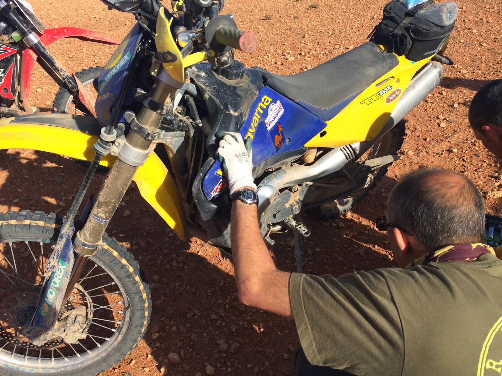 Después de comer, alrededor de nuestro habitual picnic, continuamos ruta. Nuestras máquinas van bien y nosotros estamos en forma… pero esta vez le toca a la mía. Tras pasar un oued seco, se me sale la cadena y del latigazo se rompe el cárter. Paro inmediatamente… la moto ya está perdiendo aceite. No pasa nada, Guille se ocupa de ella y en menos de 15 minutos me la deja lista para seguir rodando hacia la meta.