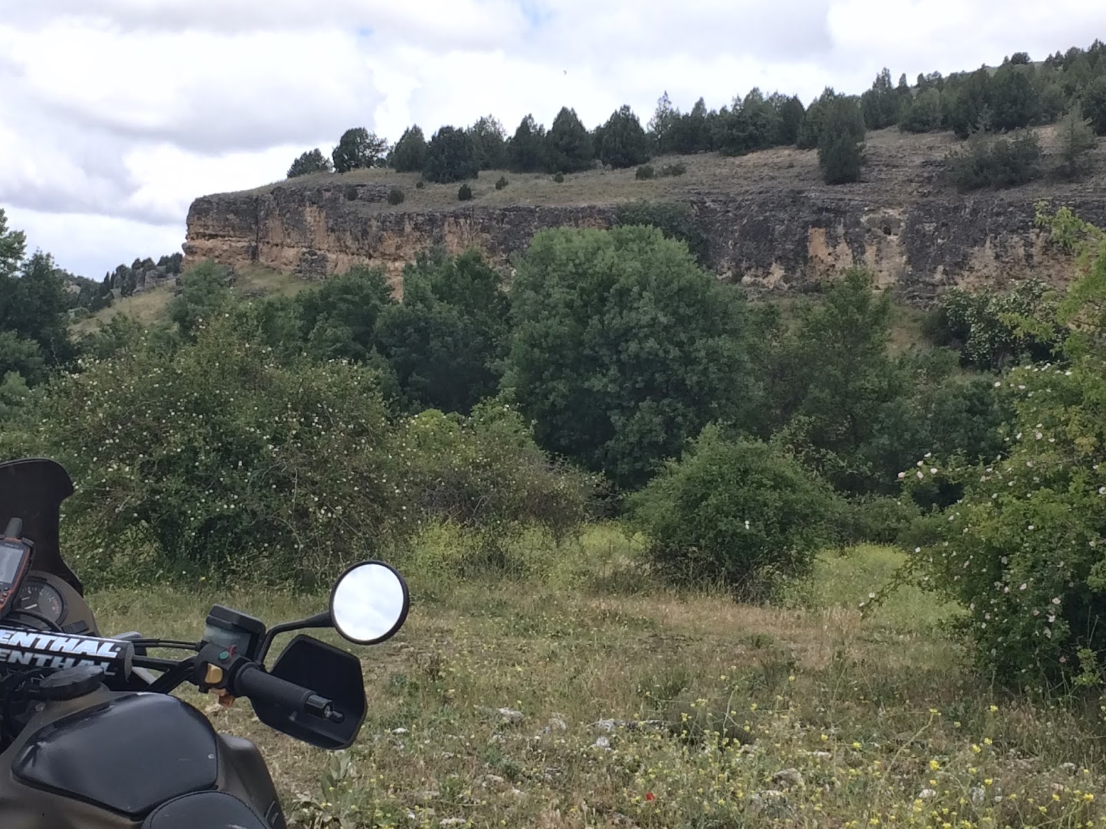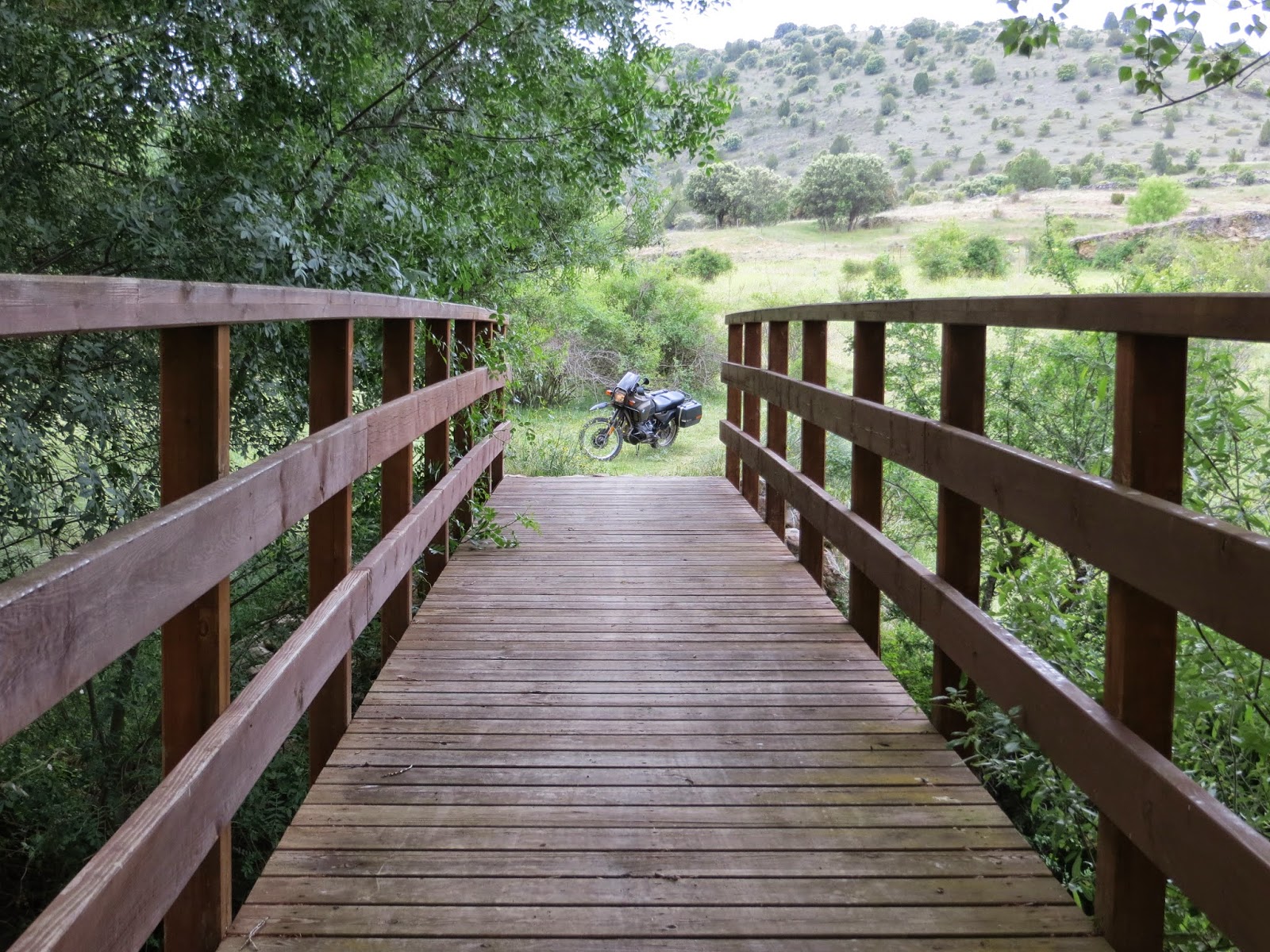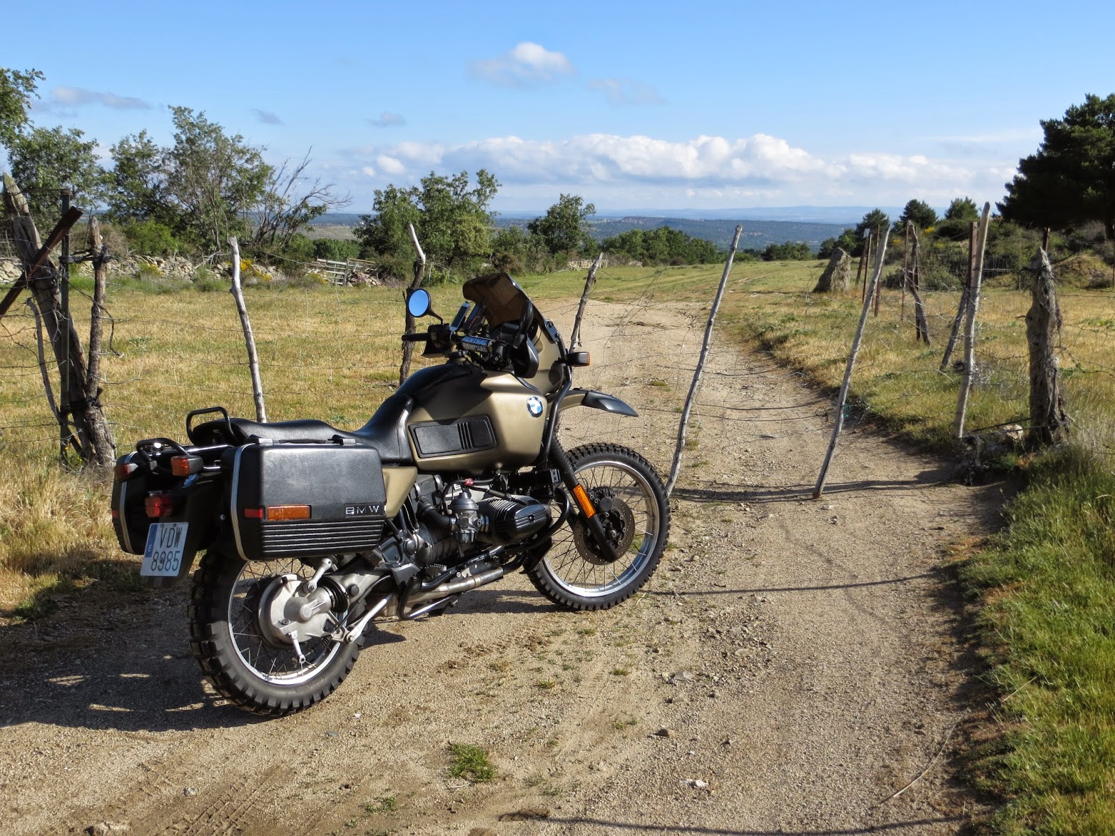 Es curioso ver cómo por aquí, en algunos caminos, los ganaderos han decidido cerrar los caminos con una supuesta puerta de alambre (tan bien atada que no fui capaz de abrir) y dejan el paso por un estrecho paso canadiense para animales, peatones y bicicletas (seguro que no han pensado en las motos). Pero digo yo… ¿y si vas en coche? Supongo que entonces, te jodes. Yo, con los cilindros y las maletas de Africana, pasé justito justito.