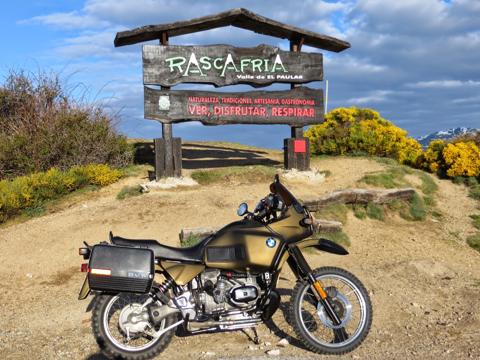 Aunque iba abrigado, ya comenzaba a tener bastante frío. Quedaba poco para Rascafría, y allí correspondería cuidar al cuerpo dándole un cafetito caliente con un pequeño desayuno. Así entraría en calor. Siempre paro en el mismo bar. Desde la misma plaza de Rascafría se toma una pequeña carretera que sube por el puerto de Navafría y atraviesa la Sierra comunicando la Provincia de Madrid con la de Segovia. Al llegar a lo alto dejamos atrás el cartel de Comunidad de Madrid, con lo que ello significa: bye, bye prohibición genérica de pisar pistas. Africana comienza a relinchar con el aroma a campo…