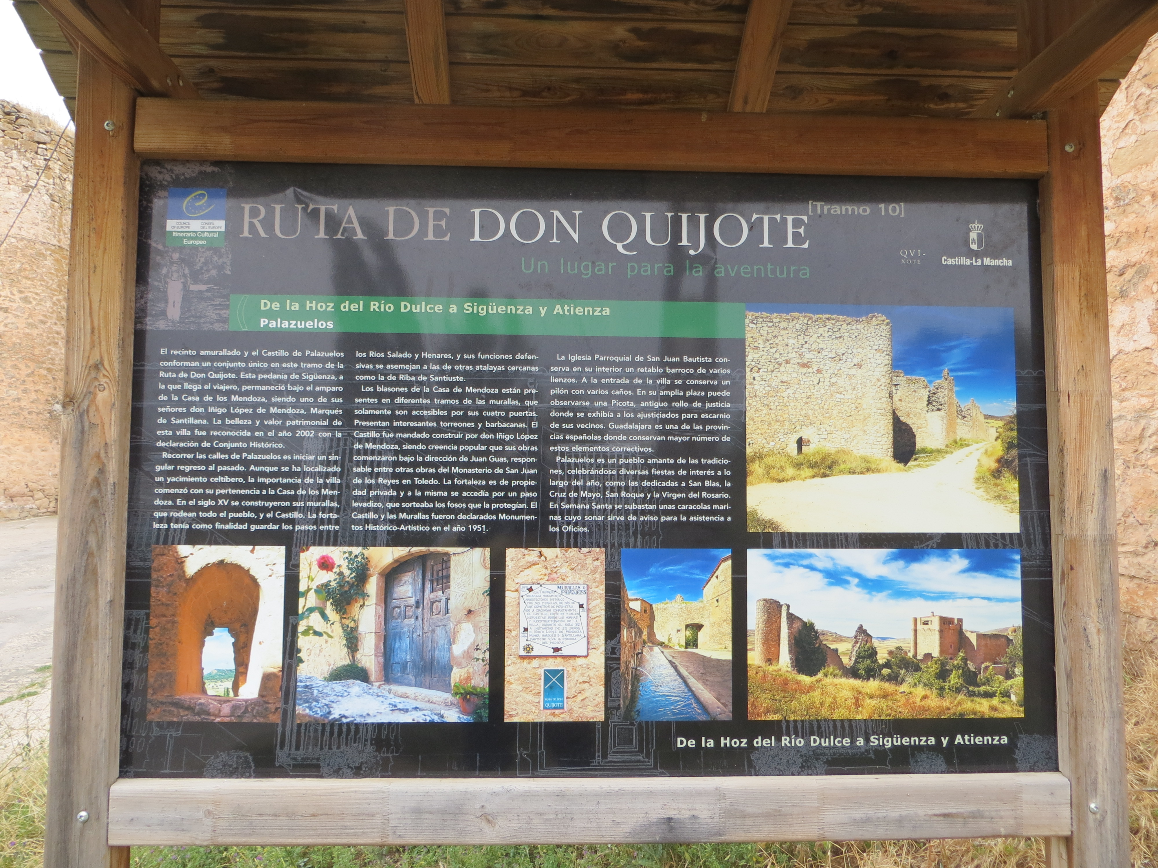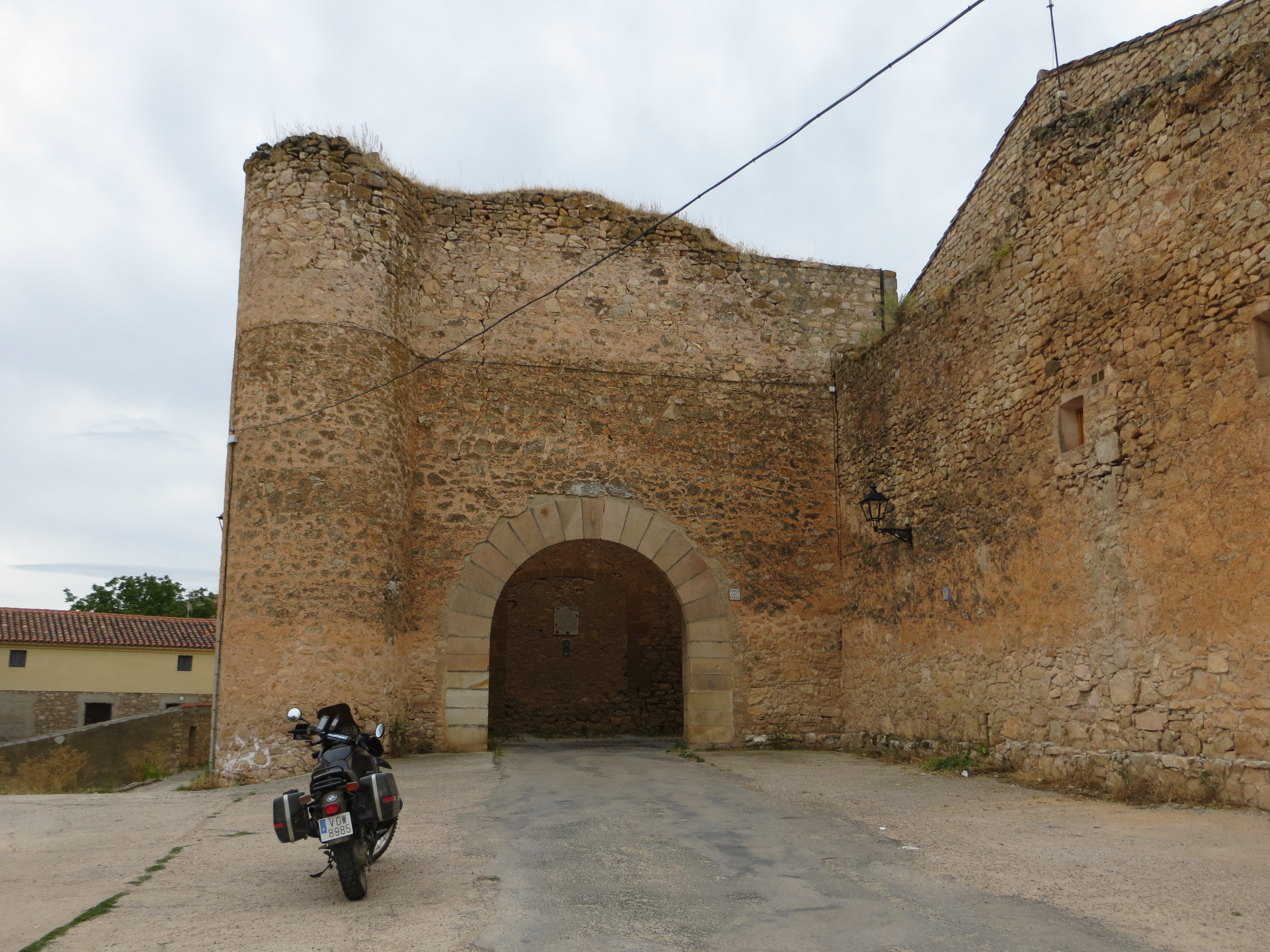 Al entrar en Palazuelos tuve que bajarme de la moto. El cartel de la entrada da la bienvenida al viajero con una pequeña historia del pueblo y la llamada de atención de que estoy en uno de los puntos de la denominada Ruta del Cid. La minúscula plaza fuerte es todo arquitectura: rodeado por una muralla, tres puertas con sus escudos permiten el acceso al pueblo en el que tan sólo hay un bar en la plaza y un pequeño castillo/torre en la zona ; está completamente restaurada y no sé si es una residencia particular o un establecimento hotelero. Pero, dese luego, debe ser un lugar mágico a la luz de la luna.