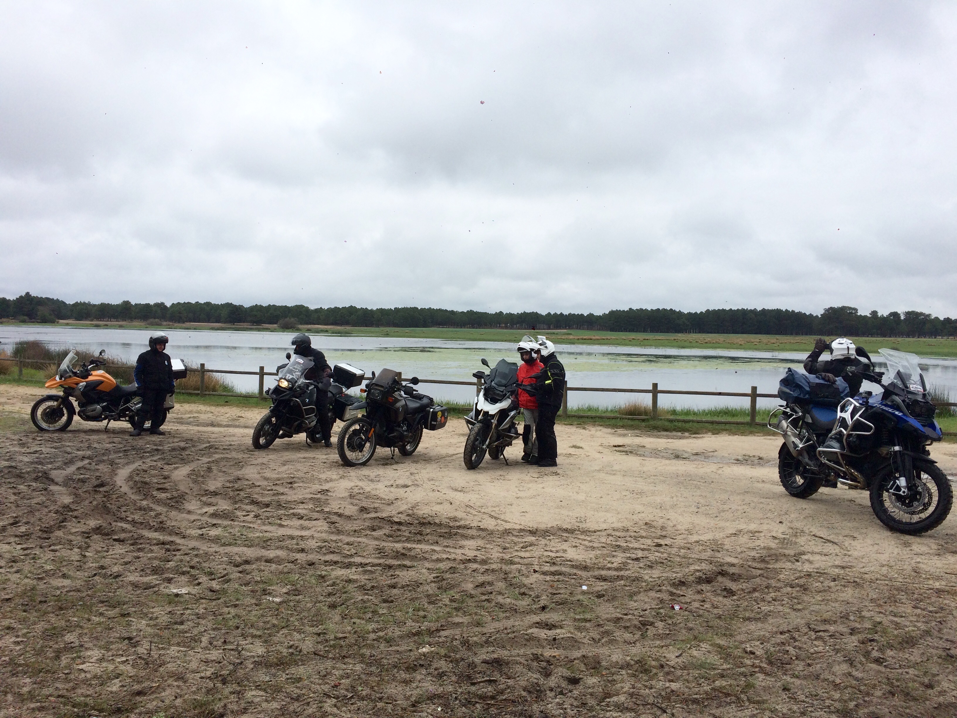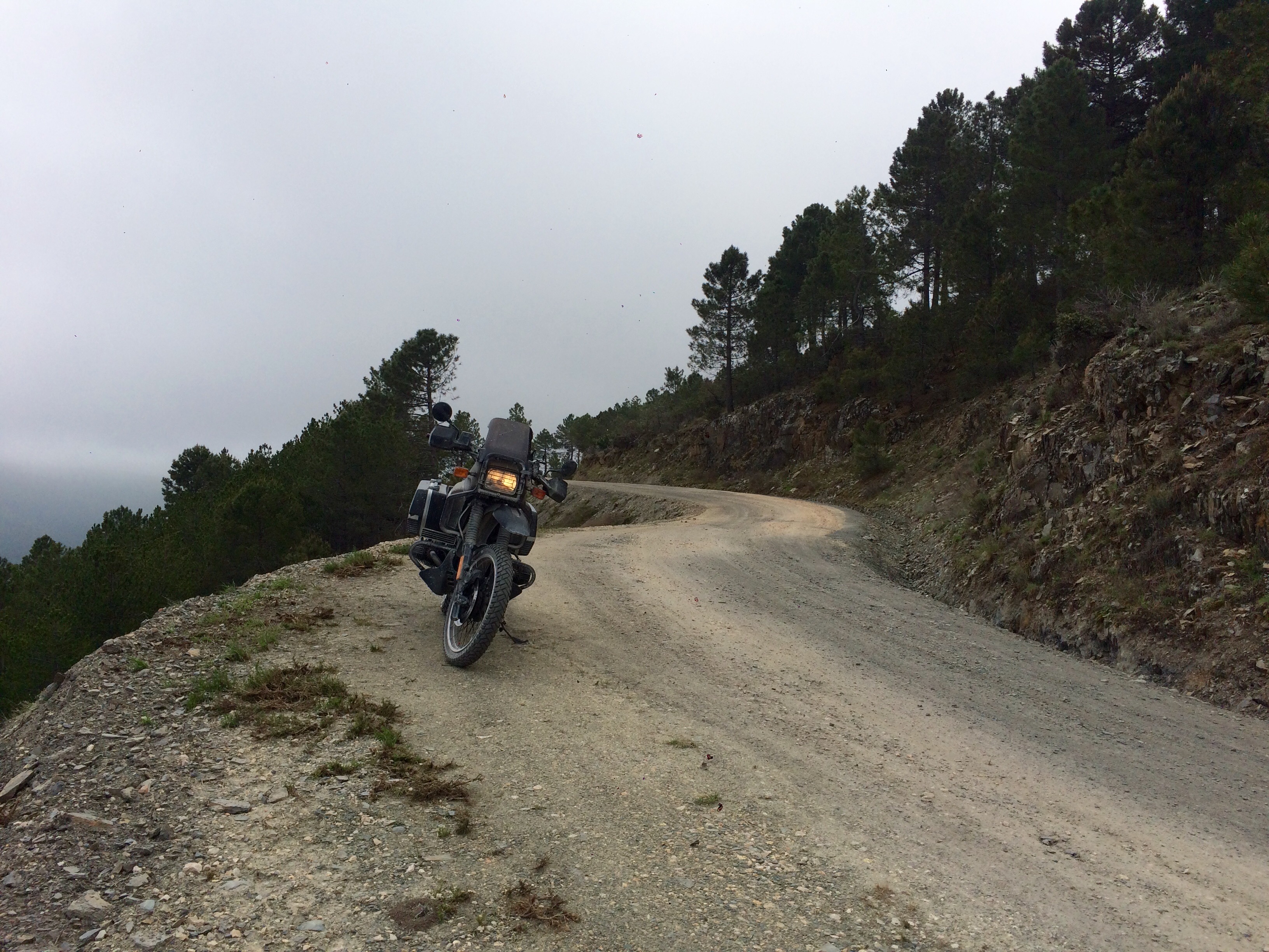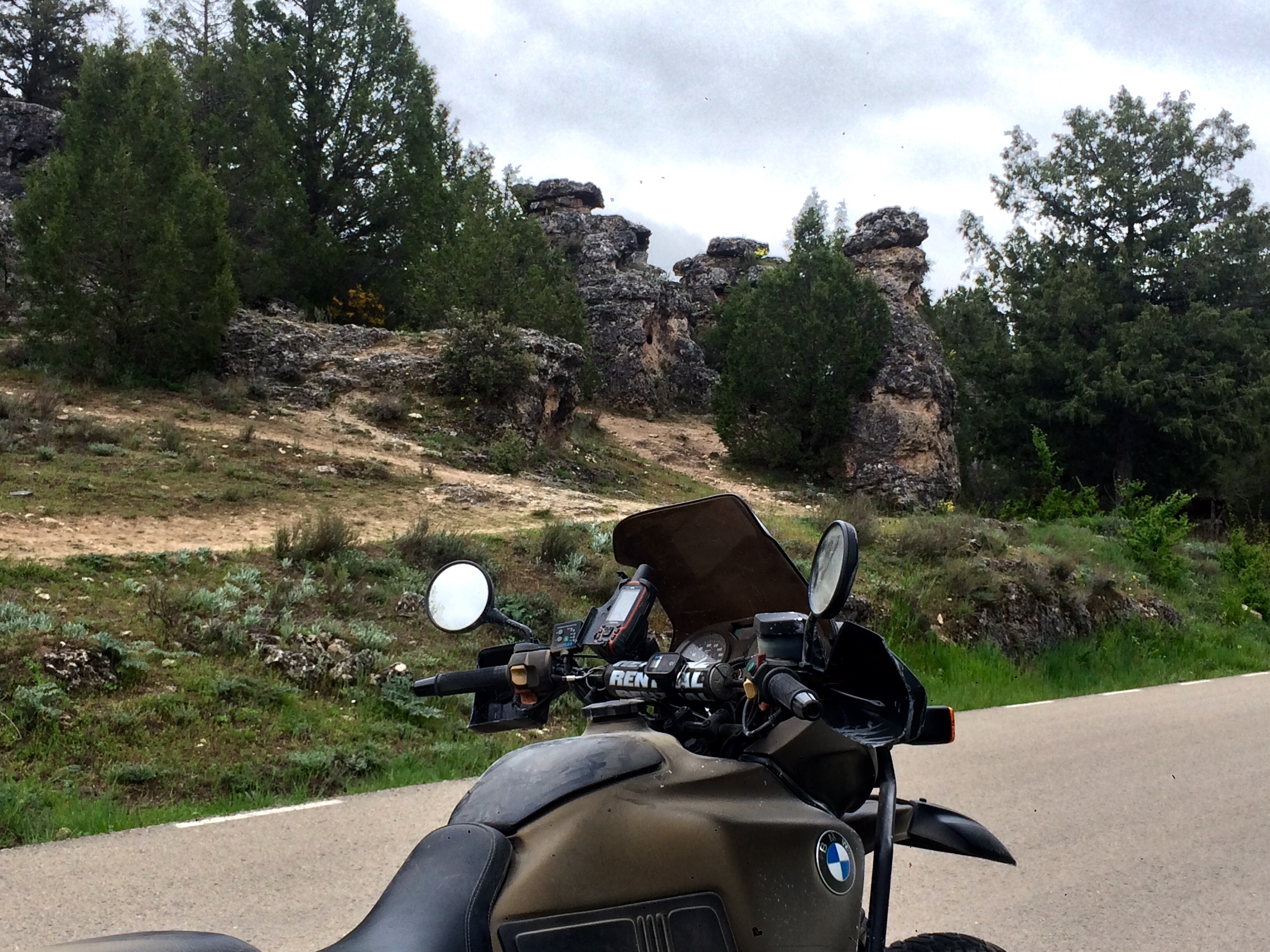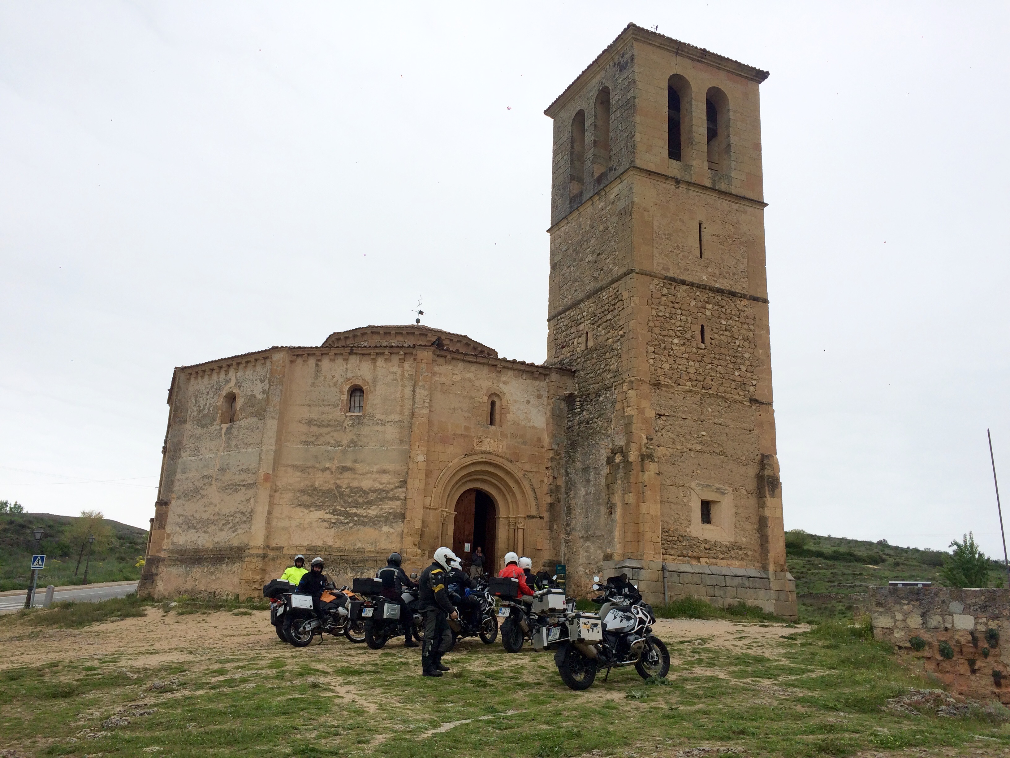 Poco a poco iba quedando atrás la ciudad y entrábamos en la primera pista hacia Torrecaballeros, con una de las peores compañías: la lluvia. El terreno resbaladizo y el sobrepeso de las motos cargadas con las maletas dificultaron el avance; pero cuando cuando hay ganas y pericia, no hay obstáculo que frene una “expedición trail”. La pequeña carretera que pasa por Brieva y cruza el Río Pirón serpentea entre zonas arboladas, pero el asfalto no es malo del todo y conducimos sin problemas. Atravesamos Adrada de Pirón recordando el camino que bordea eso río y los paisajes de su valle, a los que no podemos acercarnos por falta de tiempo. Desde TorreIglesia, de nuevo, tomamos pista hasta Carrascal y luego Turégano. Allí, un poco mojados por la lluvia, optamos por dedicarnos media hora y relajar el cuerpo con una “sin”.